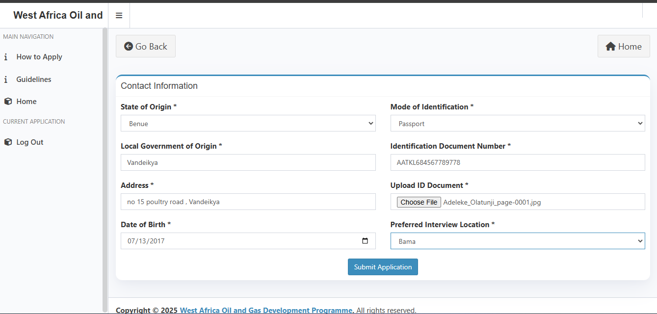 Fill in your contact informations then select and upload a valid means of identification .You are also required to select a preffered location to sit for your interview upon sucessfull selection .